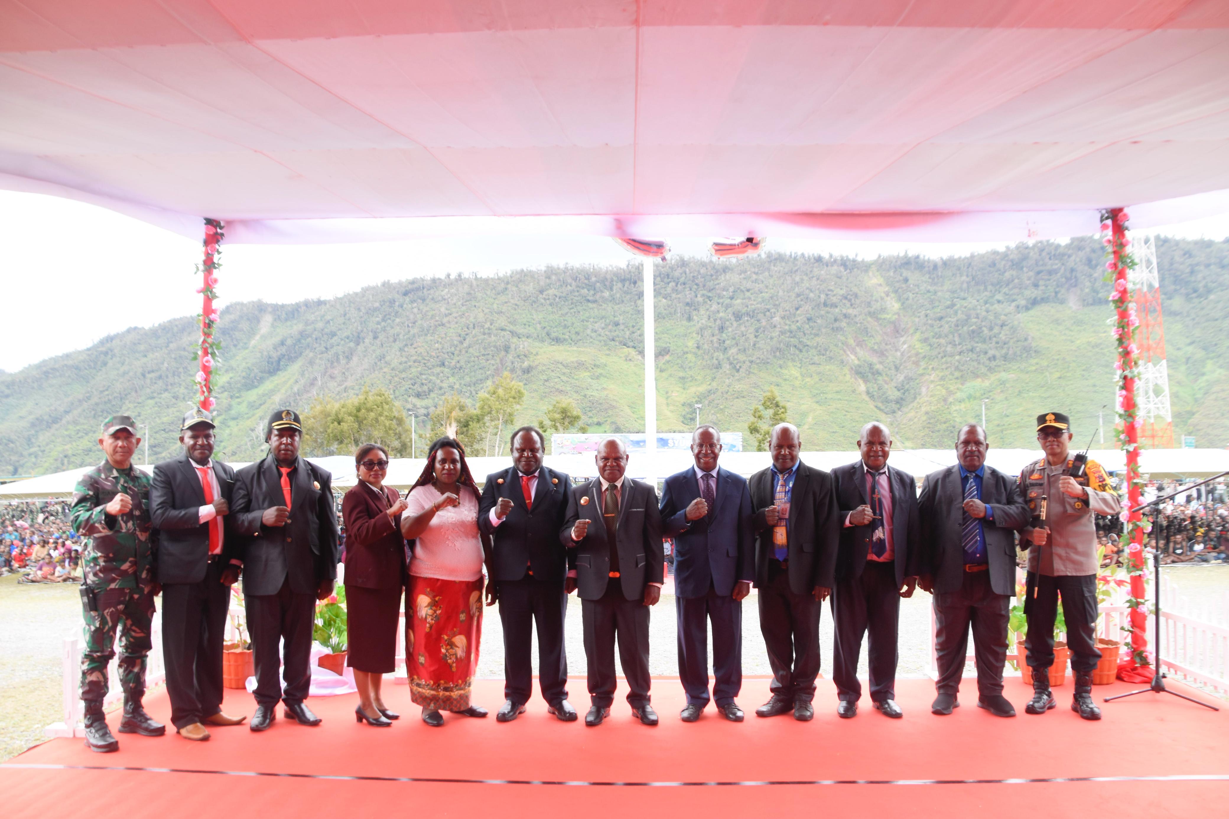 Turut hadir dalam momen penuh berkat ini, Bupati Puncak Jaya Dr. Yuni Wonda, S.Sos., S.IP., M.M., Wakil Bupati Mus Kogoya, S.E., Penjabat Sekretaris Daerah Yubelina Enumbi, S.E., M.M., M.H., serta unsur Forkopimda, tokoh agama, tokoh adat, dan masyarakat dari berbagai distrik.