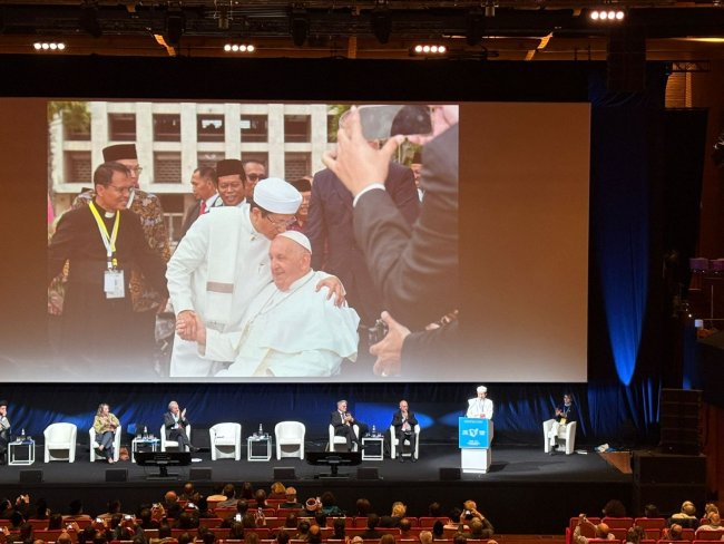 VATIKAN,wartaplus.com - Menteri Agama Nasaruddin Umar menjadi salah satu pembicara pada Forum Internasional untuk Perdamaian “Daring Peace” di Vatikan – Roma. Di hadapan para tokoh dunia, Menag bicara tentang persaudaraan dan mengenang persahabatannya dengan mendiang Paus Fransiskus. Tepuk tangan tamu undangan sangat panjang di akhir sambutan Imam Besar Masjid Istiqlal.