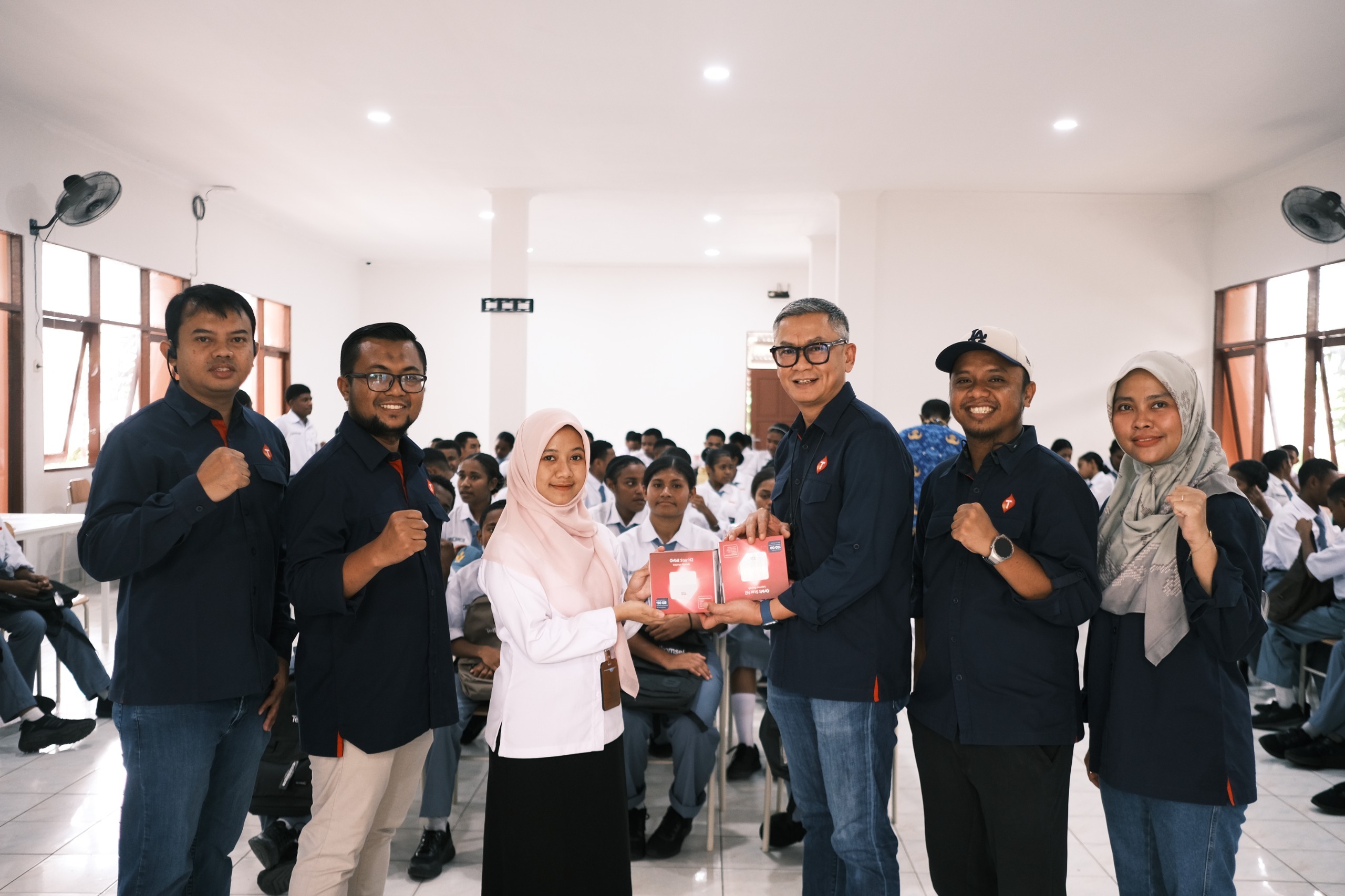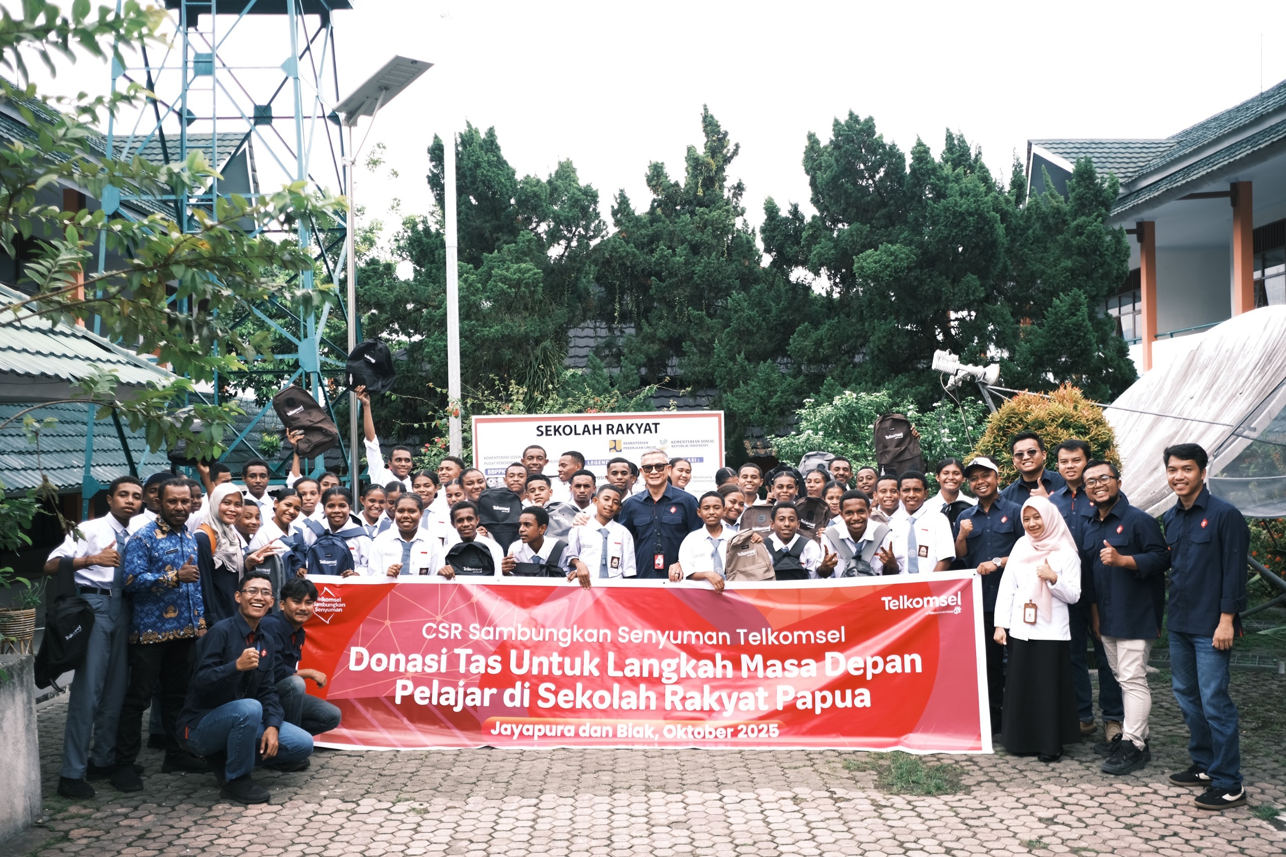 Kali ini, Telkomsel menyerahkan bantuan berupa tas sekolah, alat tulis, dan perangkat Telkomsel Orbit ke Sekolah Rakyat yang berada di Jayapura dan Biak, Papua.