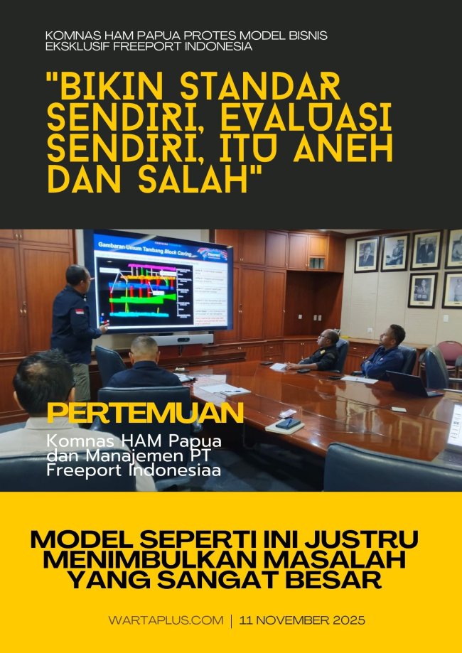 "Kami juga melakukan pendalaman terhadap HAM dan bisnis di PT Freeport yang masih cenderung eksklusif. Jadi dia bikin standar sendiri, dia melaksanakan sendiri, dia evaluasi sendiri, dan menilai sendiri. Itu aneh soal standar bisnis dan HAM," tegas Ketua Komnas HAM Papua, Frits Bernard Ramandey, kepada wartaplus.com, Selasa (11/11/2025) pagi.