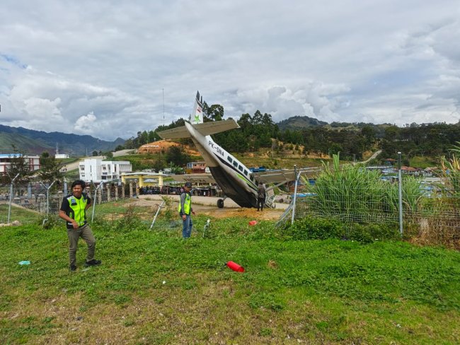 JAYAPURA, wartaplus.com - Pesawat Smart Air Jenis Caravan C208 dengan nomor registrasi PK-SNA tergelincir di Lapangan Terbang Tiom, Kabupaten Lanny Jaya, pada Sabtu (11/10/2025) pagi. Pesawat yang mengangkut bahan makanan diketahui terbang dari Bandara Mozes Kilangin Timika menuju Tiom, Kabupaten Lanny Jaya.