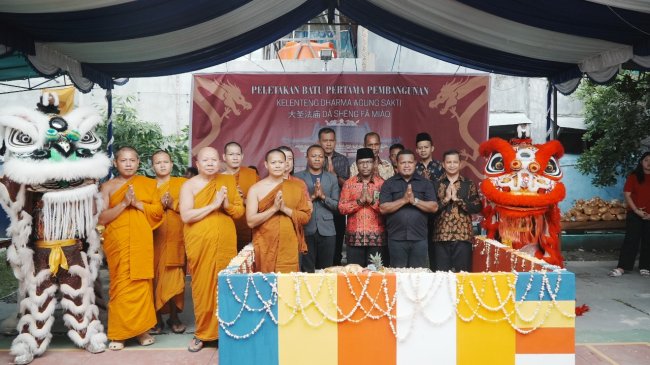 SENTANI,wartaplus.com - Kepala Kantor Wilayah Kementerian Agama (Kakanwil Kemenag) Provinsi Papua, Klemens Taran, bersama Wakil Bupati Jayapura meletakkan batu pertama tanda dimulainya pembangunan kelenteng Dharma Agung Sakti, Kelenteng pertama di Provinsi Papua. Peristiwa bersejarah ini dilakukan di halaman Vihara Cycloop Dhammajaya Sentani pada Minggu, (19/10/2025).